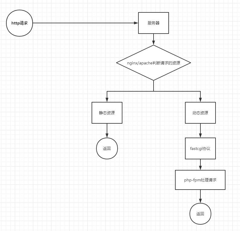 - 若是html的(静态资源)直接返回,若是.php结尾的文件,nginx就要经过fastcgi协议,再到php-fpm处理请求,php-fpm再通过fastcgi协议返回再到nginx再返回非客户端