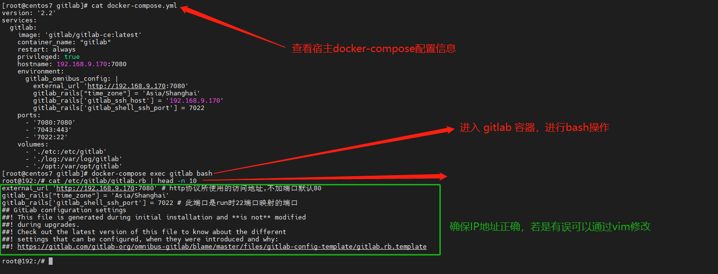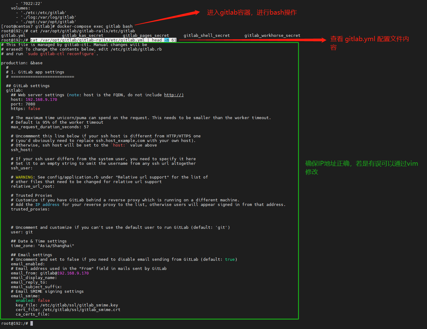 确保配置里的IP地址与宿主主机IP地址(192.168.9.170)一致,避免gitlab服务不能访问问题。